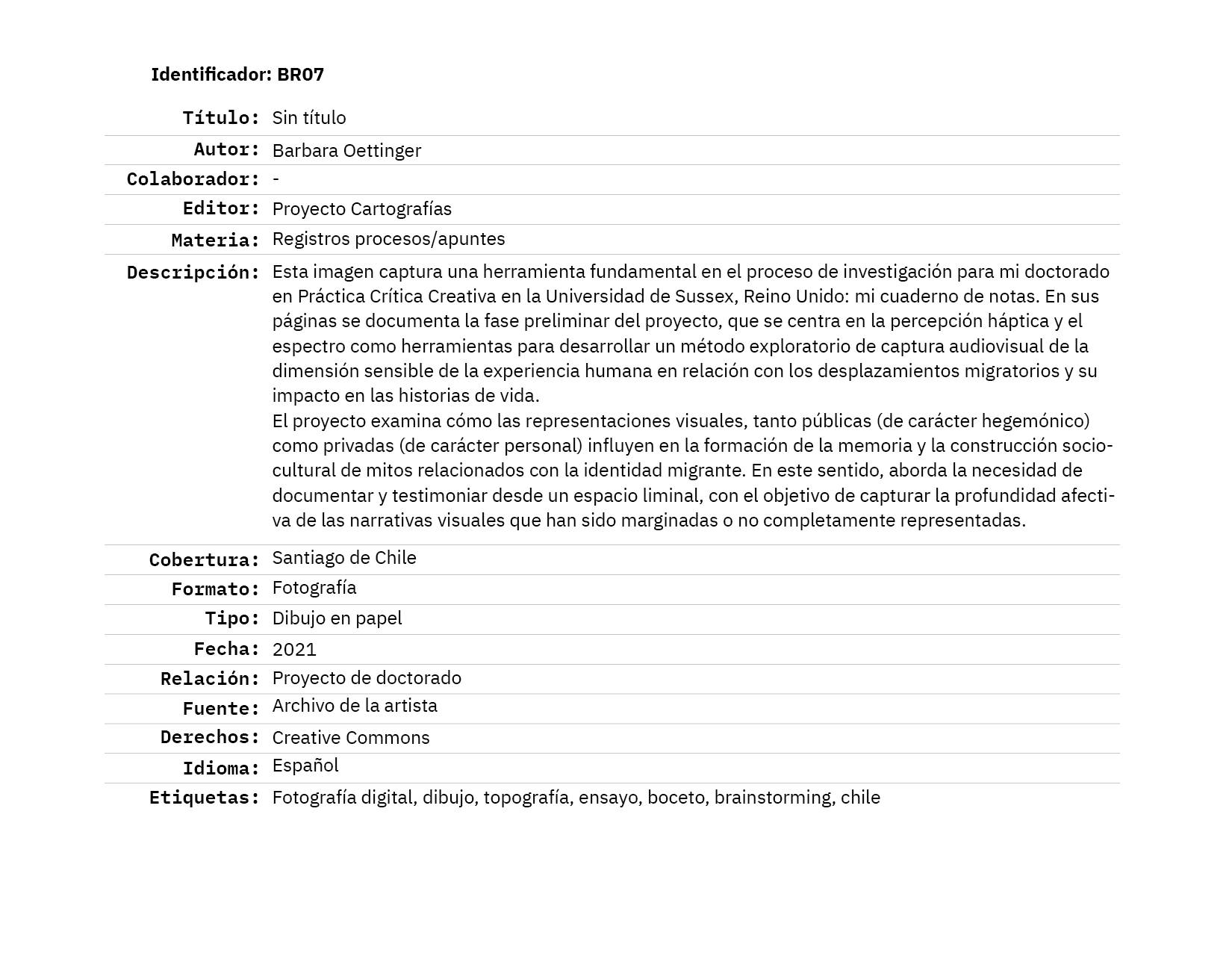 Artista visual, ilustradora y audiovisualista chilena, ha participado en el proyecto Cartografías compartiendo sus procesos creativos, su archivo y ha participado en los encuentros para la realización del proyecto colectivo, aportando sus reflexiones y pensamientos para la construcción de este trabajo colectivo que ponemos a disposición en este archivo.